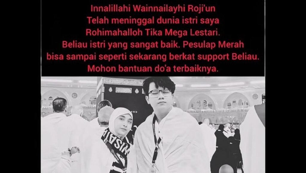 Ia menambahkan bahwa dukungan sang istri menjadi pilar penting dalam perjalanan kariernya. “Innalillahi Wainnalillahi rojiun, telah meninggal dunia istri saya Rohimahallah Tika Mega Lestari. Beliau istri yang baik. Pesulap Merah bisa sampai sekarang berkat support Beliau. Mohon bantuan doa terbaiknya,” tulisnya.